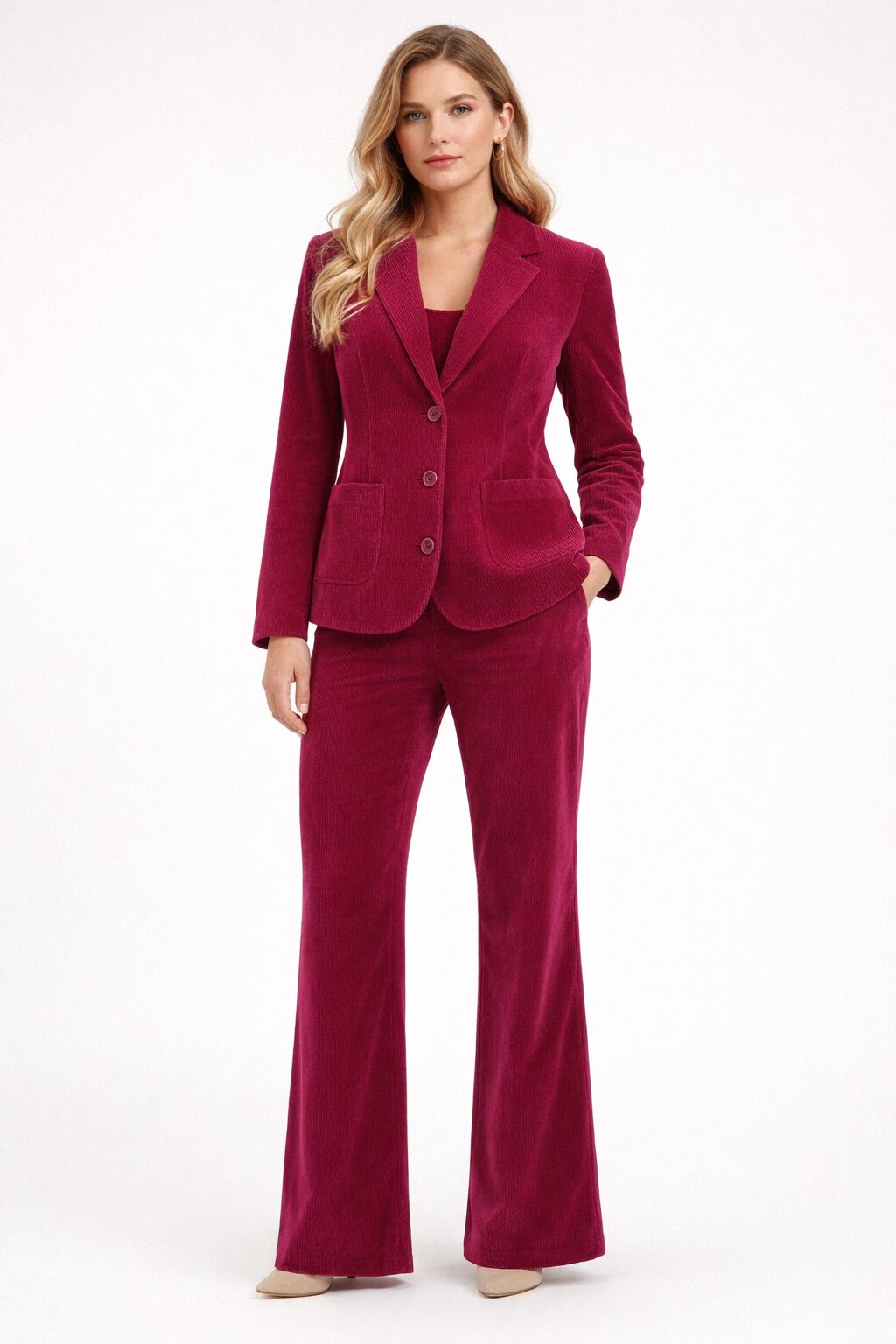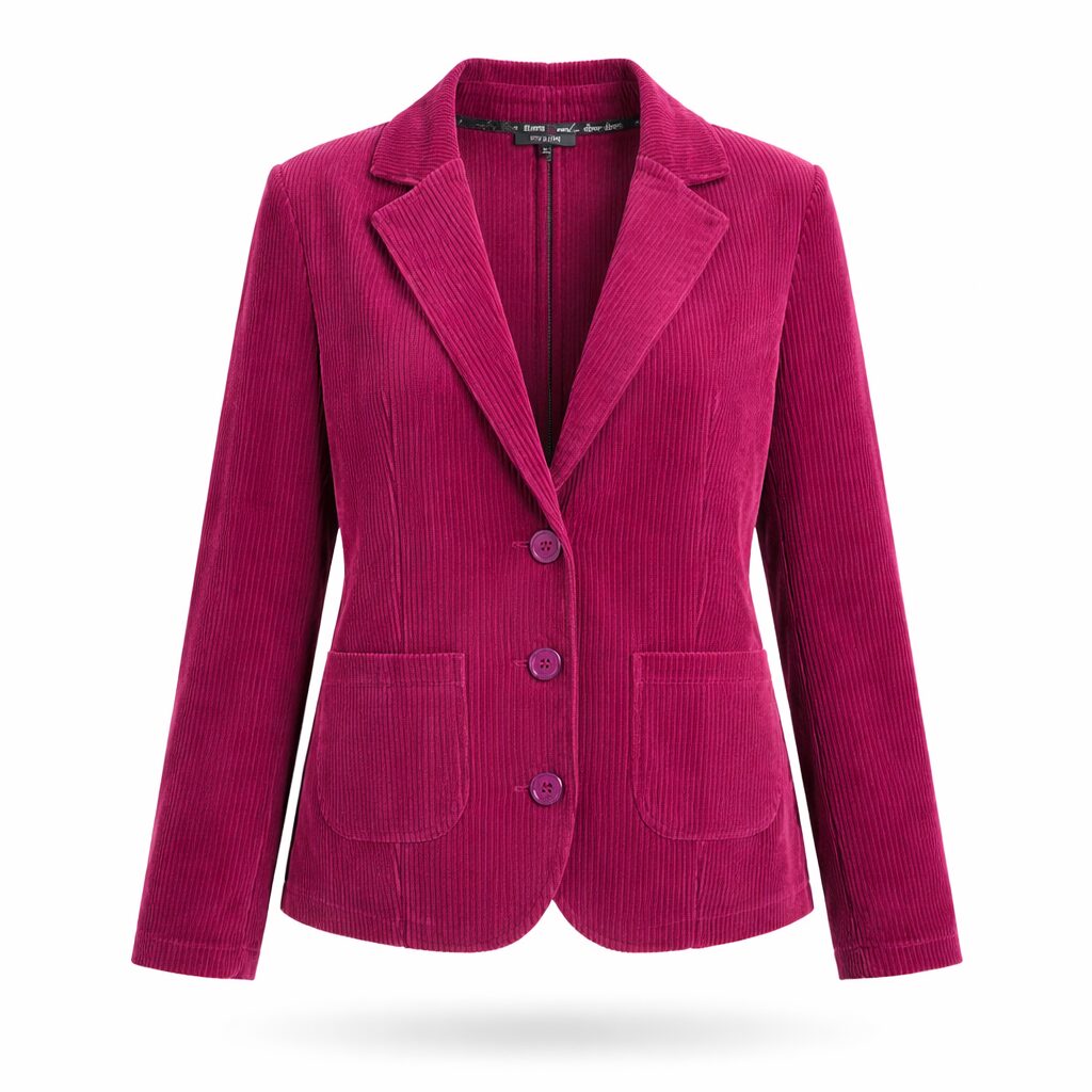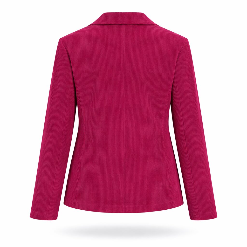 Dámsky menčestrový kostým v sýtej magenta farbe, označovanej aj ako malinová ružová, predstavuje výrazný a zároveň elegantný kúsok do moderného šatníka. Menčester sa opäť vracia do módy, a preto tento model pôsobí aktuálne, štýlovo a zároveň nadčasovo.