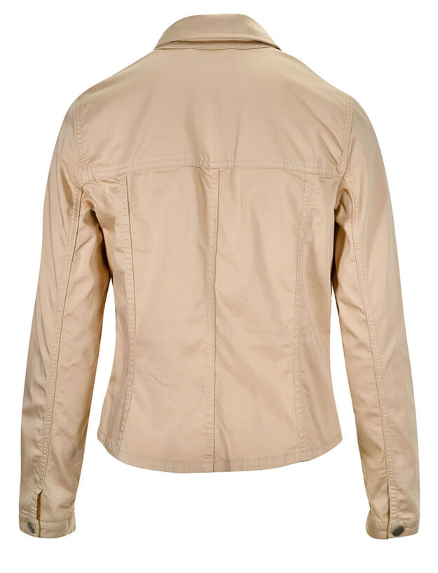 Materiál bundy tvorí kombinácia 64 % bavlna, 33 % polyester a 3 % elastan. Bavlna zabezpečuje prirodzenú priedušnosť a komfort pri nosení, zatiaľ čo elastan poskytuje pružnosť a lepšie prispôsobenie postave. Vďaka tomu sa dámska béžová rifľová bunda príjemne nosí počas celého dňa.