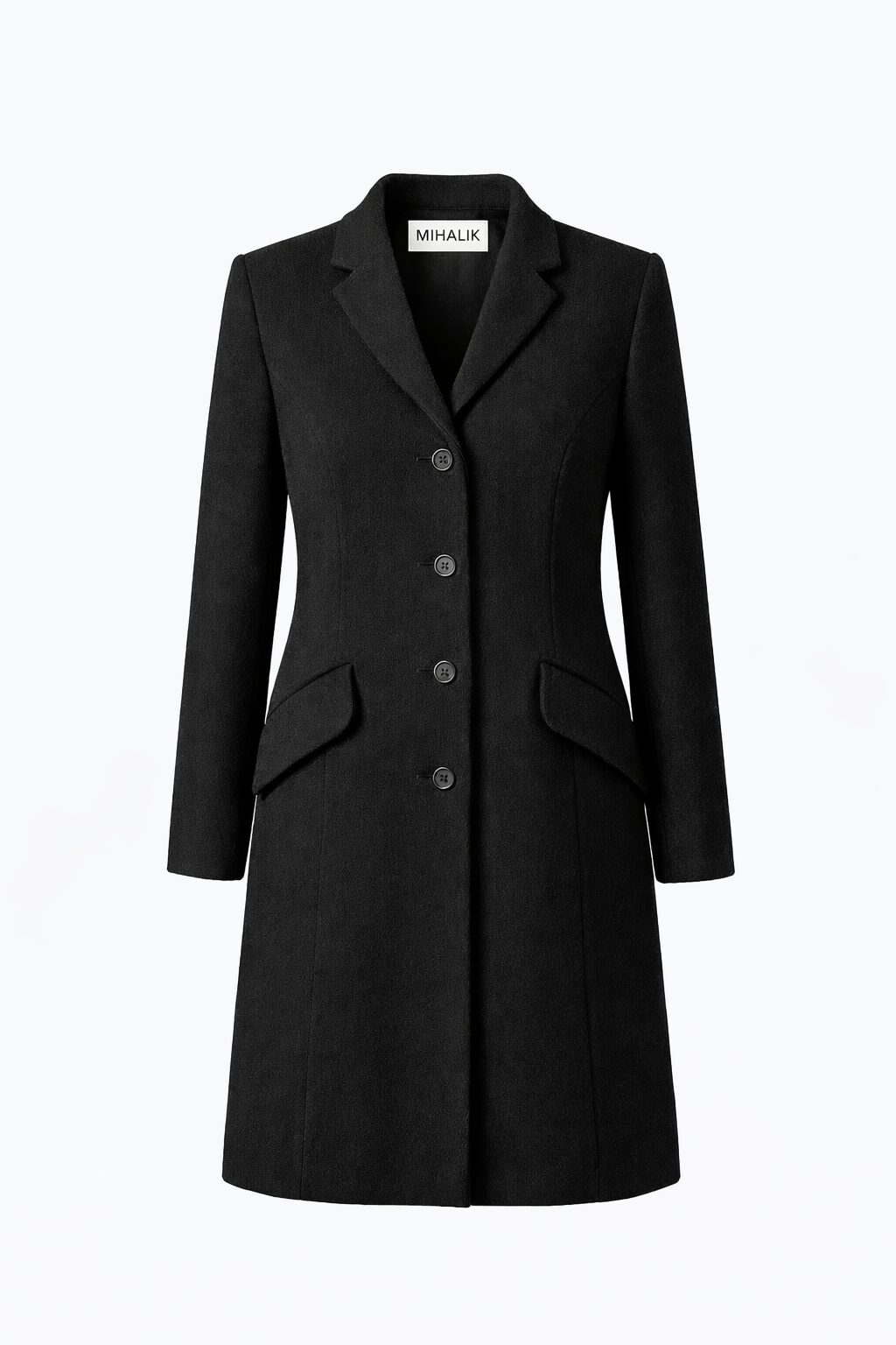 Značka MIHALIK kladie dôraz na precízne lokálne šitie a kvalitné spracovanie. Tento čierny vlnený kabát veľkosť 48 predstavuje nadčasovú investíciu do elegantného šatníka.