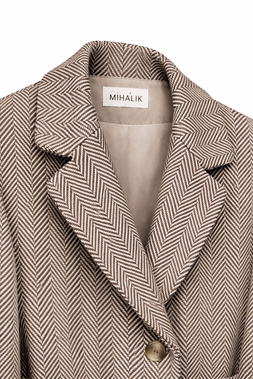Praktické všité vrecká zachovávajú čistú líniu modelu. Zároveň ponúkajú funkčné využitie na bežné nosenie do práce či do mesta. Hnedý kabát so vzorom rybia kosť sa navyše ľahko kombinuje s neutrálnymi aj výraznejšími farbami.
