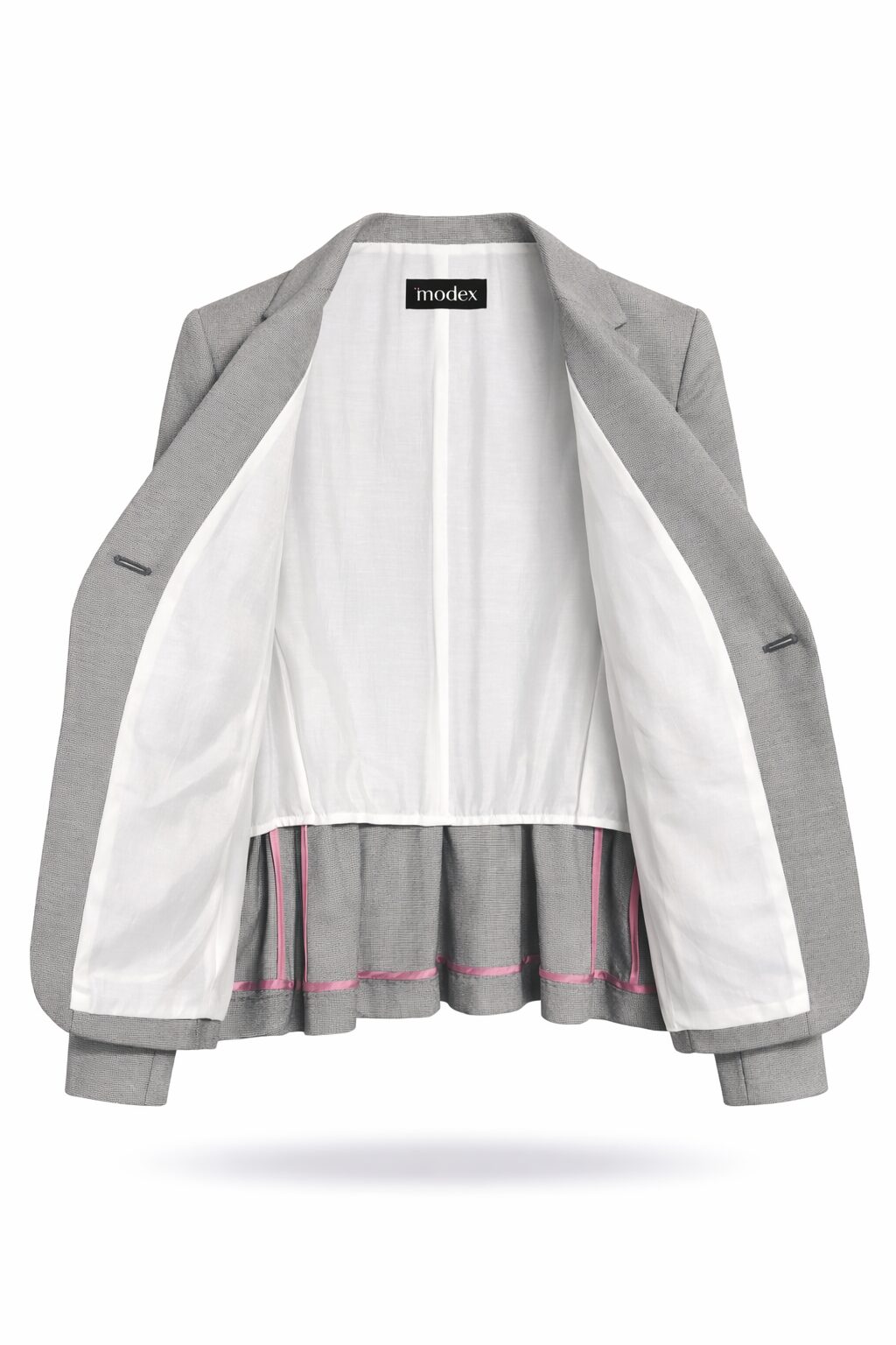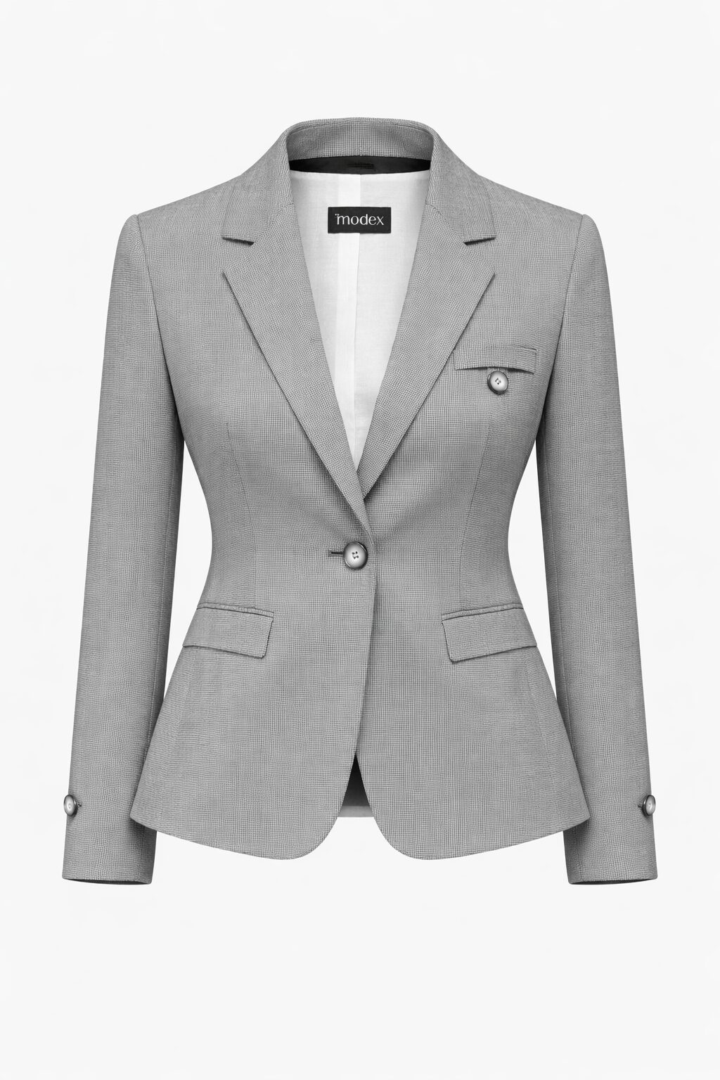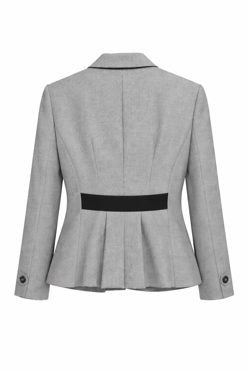 Sako upúta prepracovaným strihom a ženskými detailmi. Zapína sa na jeden gombík, čím zvýrazní pás a opticky formuje siluetu. Okrem toho má dve všívané vrecká a jedno náprsné vrecko na gombík. Na rukávoch nájdete jemné gombíky, ktoré dotvárajú elegantný vzhľad. Zadná časť saka so „sukničkovým“ efektom dodáva modelu pohyb, ľahkosť a výraznú ženskosť.